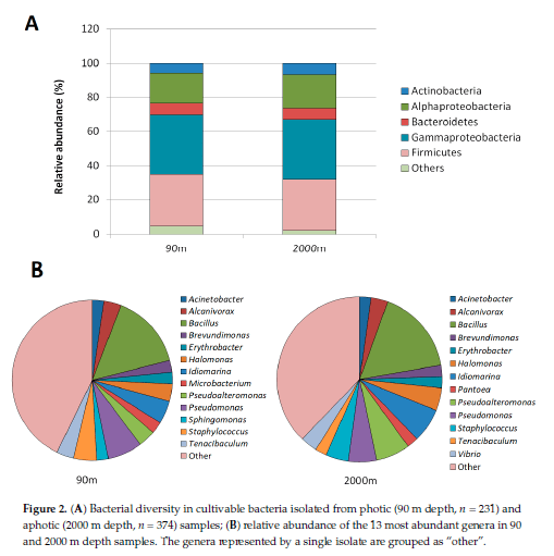 En ocasiones varias gráficas pueden usarse con el mismo objetivo. Por ejemplo, en estas representaciones gráficas incluidas como dos paneles dentro de la misma figura (Muras et al., 2018) se quiere mostrar que, aunque las bacterias se cogieron de muestras de agua muy distintas (90 y 2000 metros de profundidad) la diversidad que se encontró en las cepas aisladas en el laboratorio fue muy parecida. Es decir, aunque las muestras de agua se recogieron de ecosistemas muy diferentes, los datos indican que las bacterias que viven en ellos son muy similares en cuanto a los filos y a los géneros a los que pertenecen. Para ello, en la primera representación se comparan los filos de ambas muestras utilizando una gráfica de barras (A), en la que aparece el tipo de muestra mostrada en el eje X y la abundancia relativa expresada en porcentaje en el eje Y. En cambio, para comparar los géneros de las bacterias más abundantes en las muestras de agua de las dos profundidades se utilizaron gráficas de tartas (B). Cada muestra de agua tiene su propia gráfica de tarta, en las que cada porción representa un porcentaje del total que sería el 100%.