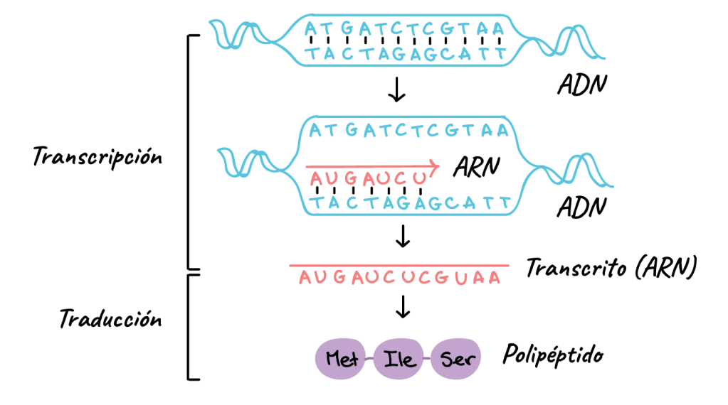 Para que la información necesaria presente en el ADN llegue a los ribosomas, que es donde se construyen las proteínas, es necesario que se forme ARN mensajero. El ARN, que se construye durante un proceso que se llama transcripción, está formado por las mismas cuatro bases nitrogenadas, con la excepción de la timina que se sustituye por uracilo (U). Estas cuatro bases nitrogenadas son las unidades que al traducirse dan lugar a las proteínas (polipéptidos) de todos los seres vivos.