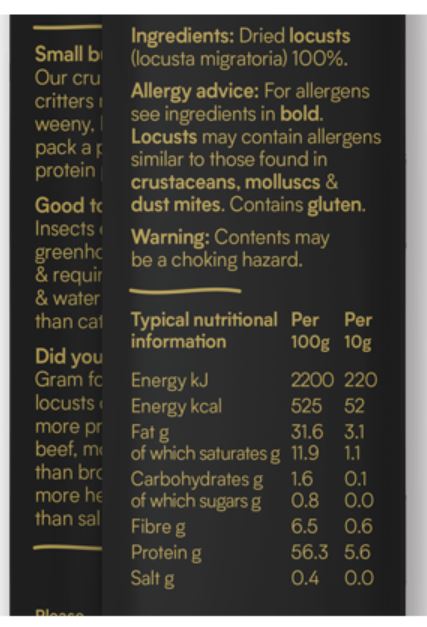 También podéis encontrar este tipo de alimentos en tiendas especializadas como Insectum donde encontré esta bolsa de langostas (10 g) a 11€. Como veis producen una gran cantidad de energía pues aunque que solo son 10 g nos aportan 220 kJ (o 52 kcal). Esta bolsa de langosta es muy rica en proteínas (5,6 g) y apenas contienen carbohidratos (0,1 g).