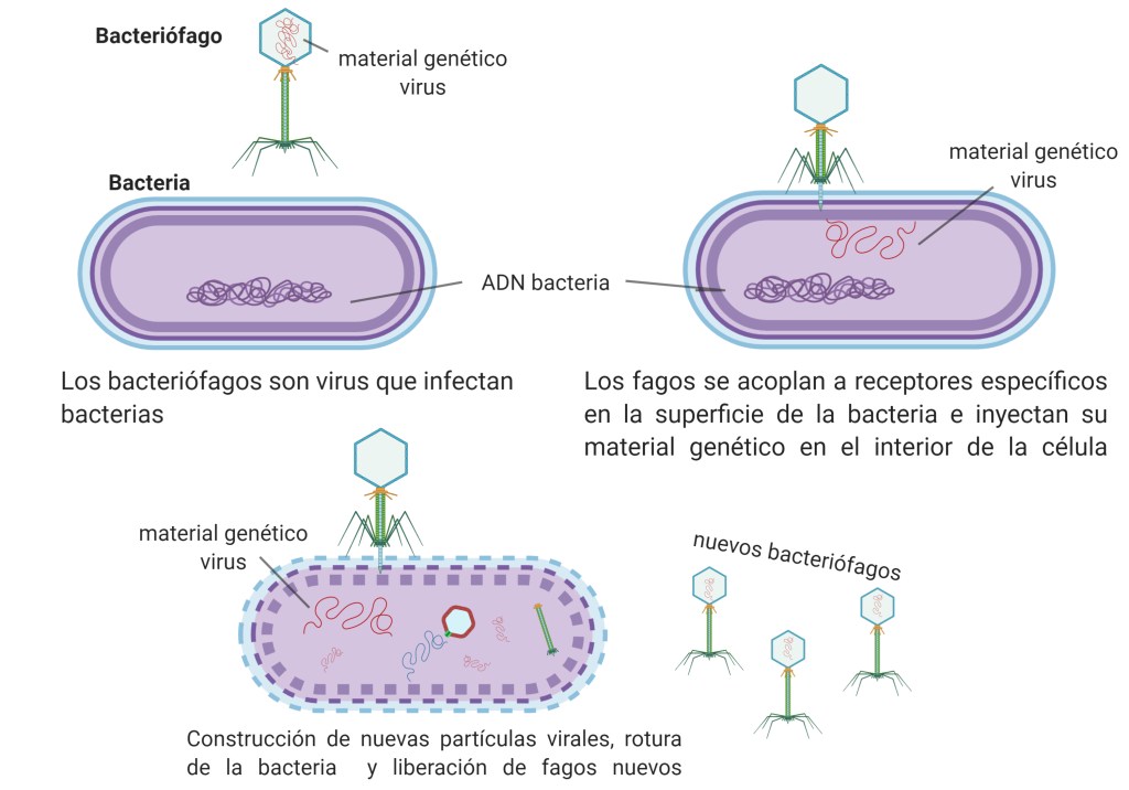 Los bacteriófagos son virus que infectan a las bacterias y fueron descubiertos de forma independiente por el británico Frederick Twort en 1915 y el franco-canadiense Félix d’Hérelle en 1917. Los científicos no tardaron mucho en darse cuenta de sus posibles usos. De hecho, a lo largo del siglo XX se usaron en varios países preparaciones de fagos para tratar infecciones de la piel, septicemia, osteomielitis, infecciones por heridas, del tracto urinario o del oído medio causadas por bacterias como Pseudomonas, Staphylococcus, Escherichia coli y Serratia. Además, desde la aprobación el uso de fagos contra la bacteria Listeria monocytogenes por la FDA (U.S. Food and Drug Administration) en 2006, esta tecnología se usa en quesos y otros alimentos listos para el consumo con el objetivo de evitar infecciones alimentarias. Otros países como Nueva Zelanda, Australia o Noruega también tienen diferentes productos comerciales con fagos frente a bacterias como L. monocytogenes, Salmonella o E. coli.
