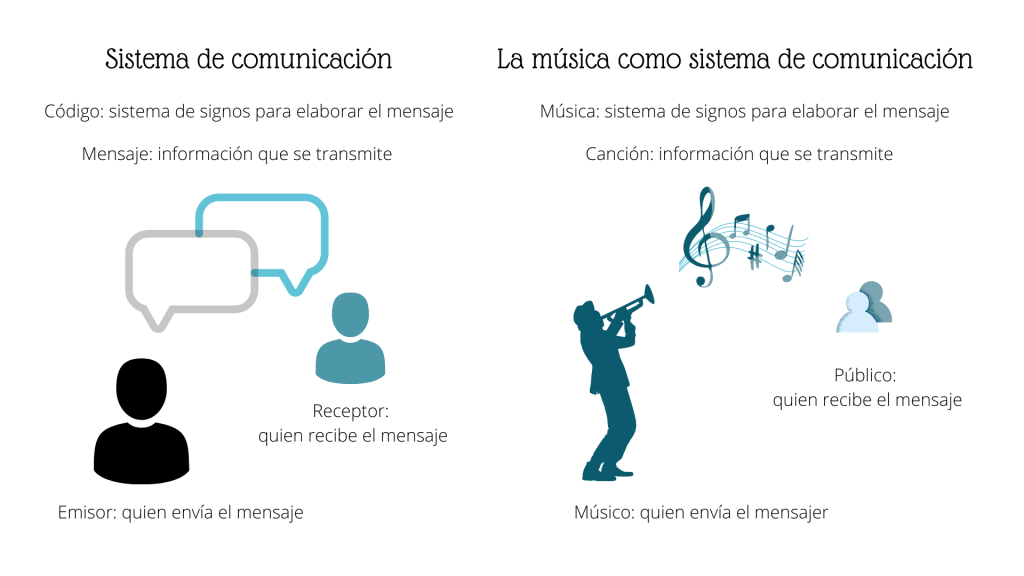 A pesar de que no se puede identificar el arte con el lenguaje sí que se puede considerar que la música lo es ya que comparte con los demás la sucesión temporal de sonidos. Además del hecho estético por la composición de sus elementos, el proceso de comunicación de la música lleva un fin socializador, ya que tiene la capacidad de generar una reacción específica en las personas. Este efecto es conocido en comunicación como retroalimentación. Para que se dé, el receptor debe tener abierta su sensibilidad e interpretar el mensaje de la obra estética. Expresar es manifestar con signos exteriores lo que uno piensa o siente y eso también es comunicar; es decir, hacer partícipe a otro, valiéndose de un código compartido.